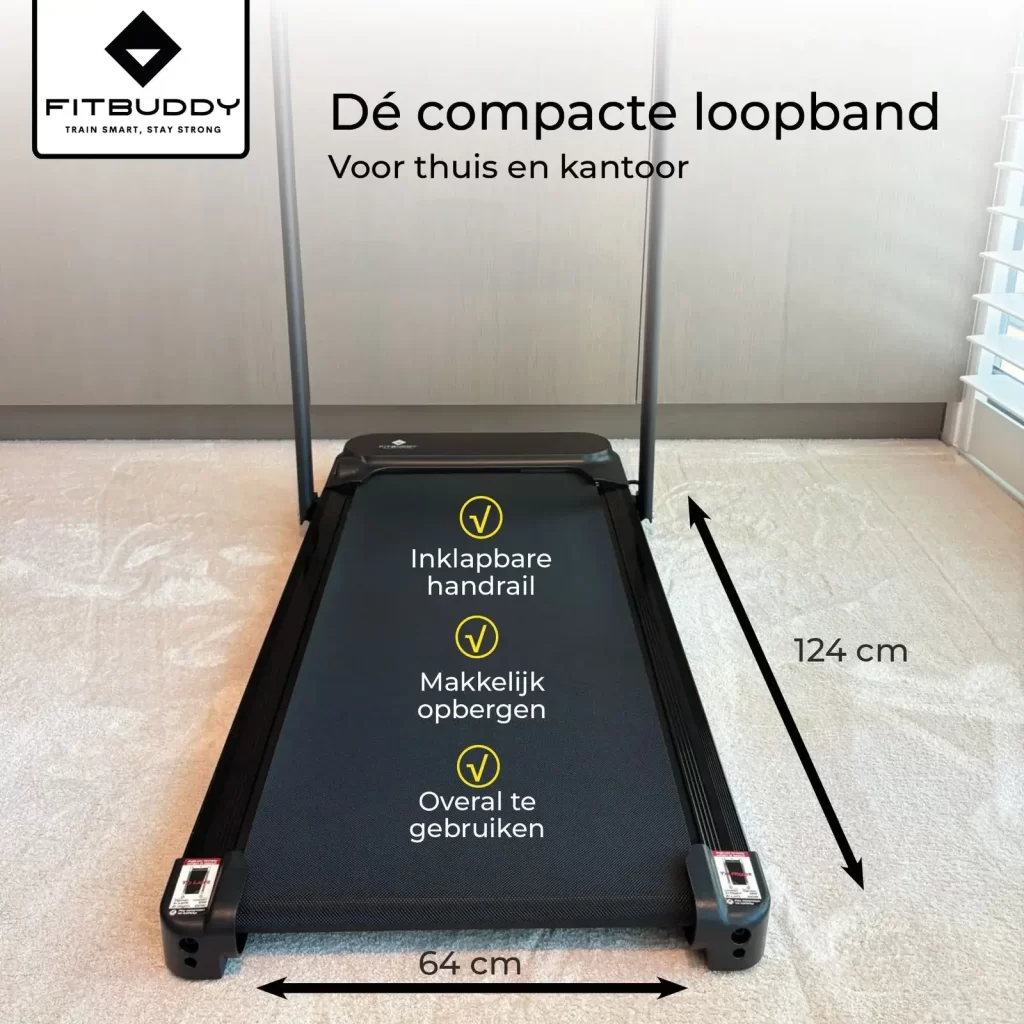 Onze loopband is slechts 124 x 64 cm groot en vouwt volledig plat. Hij past moeiteloos onder een bed of bureau.