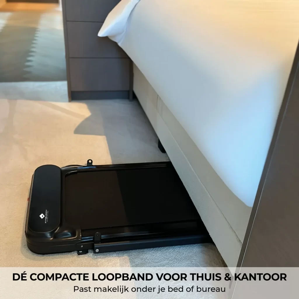 De loopband schuift probleemloos onder je bed weg en is binnen 10 seconden weer klaar voor gebruik. Ideaal voor studio’s, kantoren en studentenkamers.