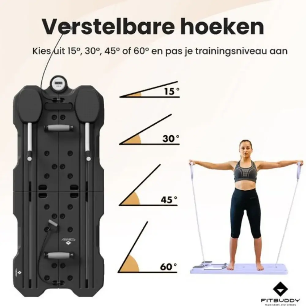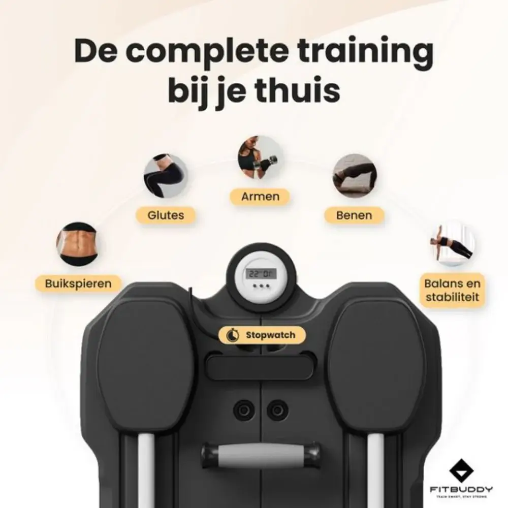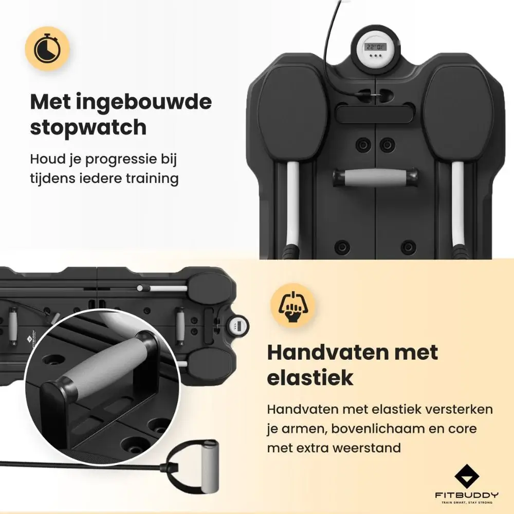 Train slimmer met één compact apparaat. Verstelbare hoeken, handvaten met elastiek, stopwatch én antislip matje – alles wat je nodig hebt voor een complete workout, gewoon thuis.